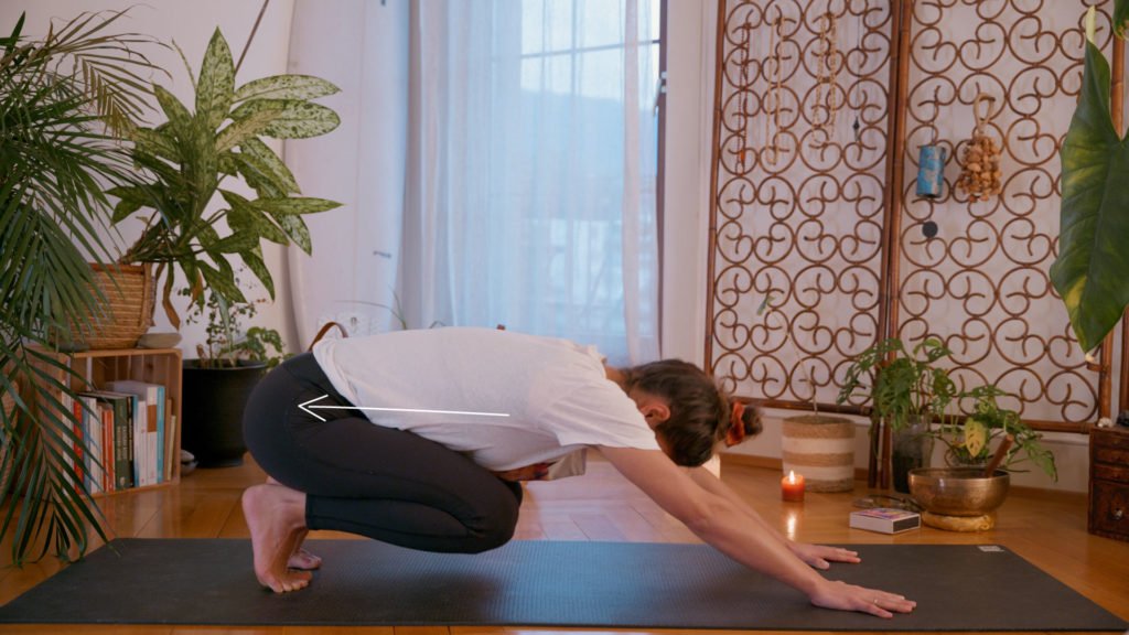 Poussez vos hanches vers l'arrière de façon à ce que vos genoux décollent du tapis et que vos fesses touchent vos talons. Imaginez que vous serrez une noisette entre le haut de vos jambes et le bas de votre ventre, juste à l'endroit où se trouve la partie avant de vos hanches.